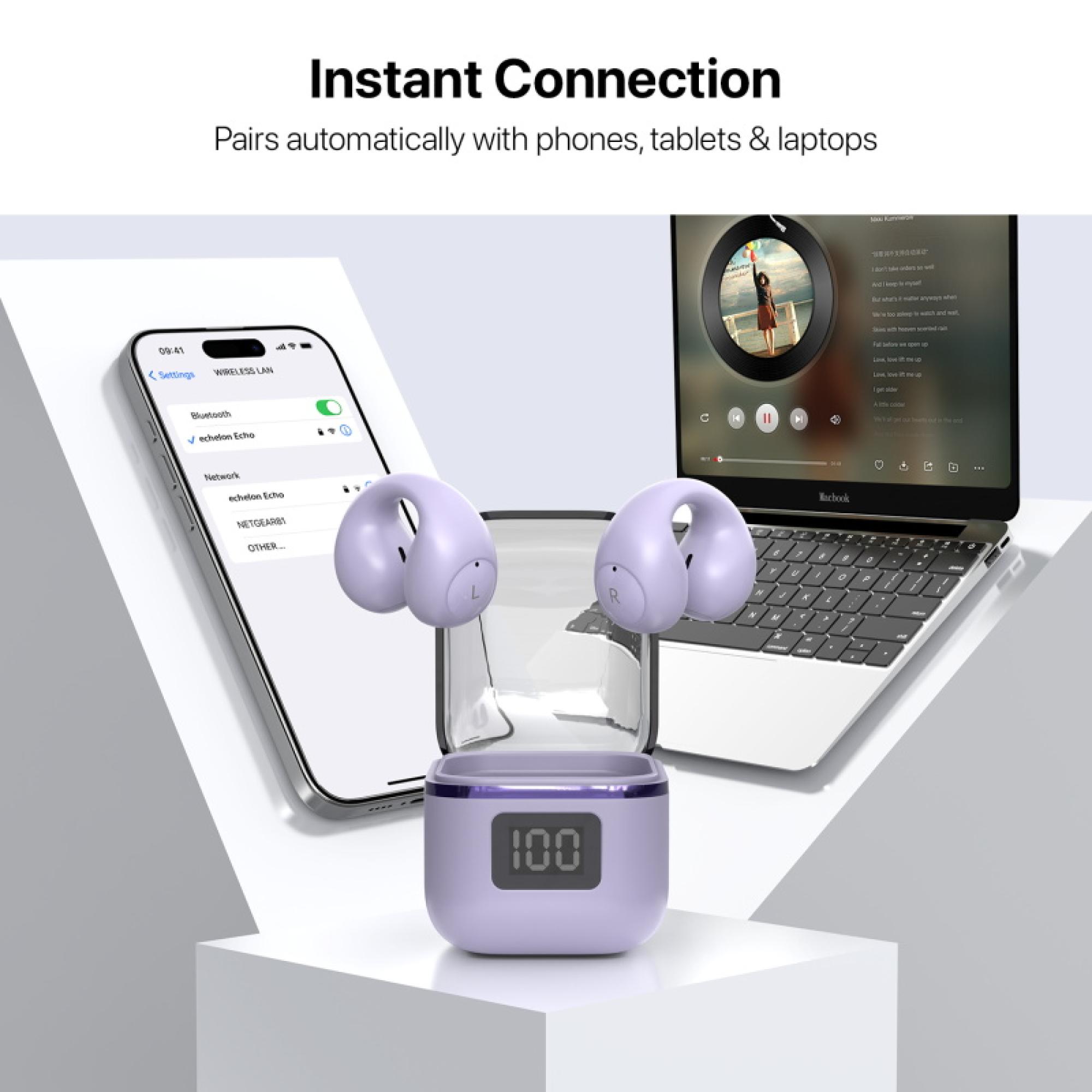 echelon Echo Open Ear Bluetooth Earbuds Lightweight Secure Fit HD Sound and 24-Hour Playtime (Purple)